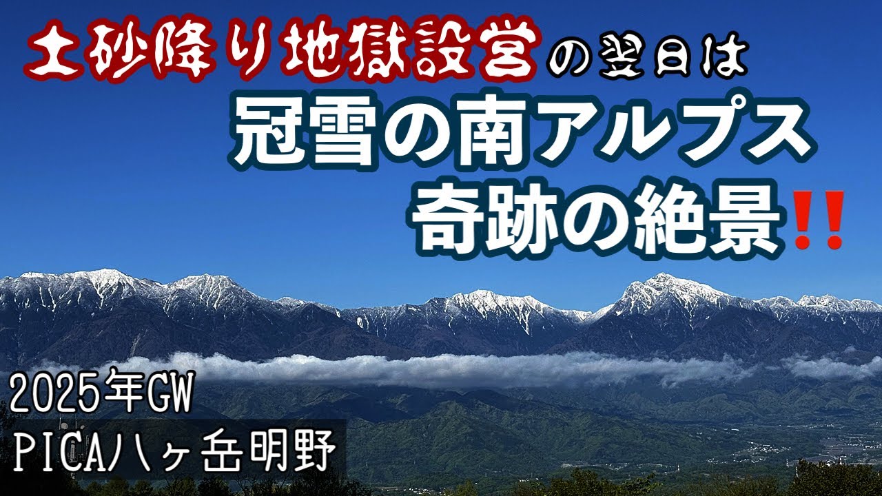 今回は、2025年GW PICA八ヶ岳明野にて、土砂降り地獄設営の翌日は、冠雪の南アルプス 奇跡の絶景!の回でございます。このところパートナーとのデュオキャンプは雨率高めでございますが、今回は初日を除き好天に恵まれました。南アルプスの絶景をぜひお楽しみください!